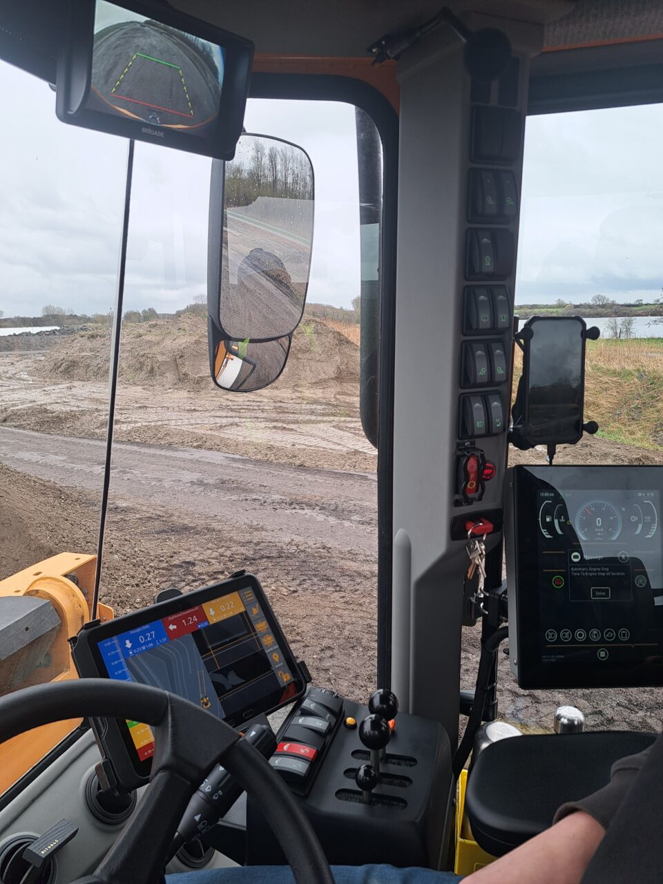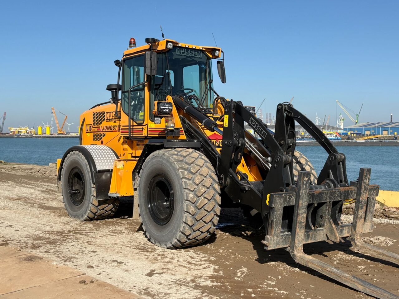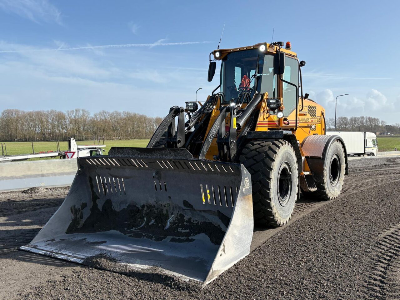 Dion Nijssen werkt al even met de machine en is blij met zijn keuze. De machine is oersterk, pakt eenvoudig 9 ton in de bak, sleept makkelijk 2 rijplaten met een totaalgewicht van 9.6 ton en draait lekker krap (45 graden), handig in krappe omgevingen. Tijdens het laden van kippers is het superfijn om de hoogste hefhoogte in de markt te hebben en je kijkt zeer goed door de parallel giek. Als je er een open systeem 2000 snelwissel op hebt laten monteren wordt het zicht optimaal.